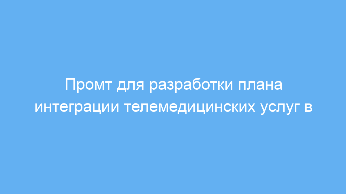Этот промт предназначен для специалистов в области медицины, телемедицины, управленцев и разработчиков медицинских сервисов. Его использование помогает быстро создать структурированный план по интеграции телемедицинских услуг, сфокусированный на лечении конкретного медицинского состояния.