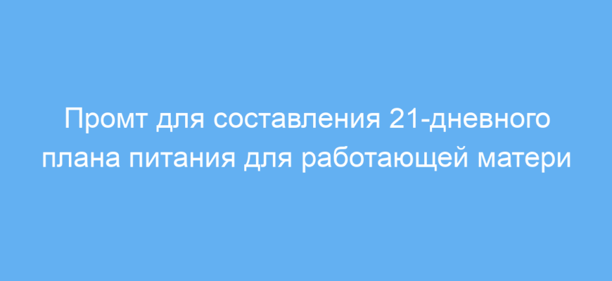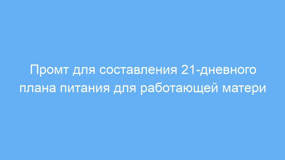 Этот промт предназначен для занятых женщин старше 35 лет, которые хотят улучшить своё здоровье и внешний вид через правильное питание. Он поможет составить подробный 21-дневный план, ориентированный на снижение веса, детоксикацию организма, улучшение состояния кожи, омоложение, гормональный баланс и повышение энергии. Такой план учитывает особенности рабочего графика и потребности организма, что особенно важно для активно работающих мам.