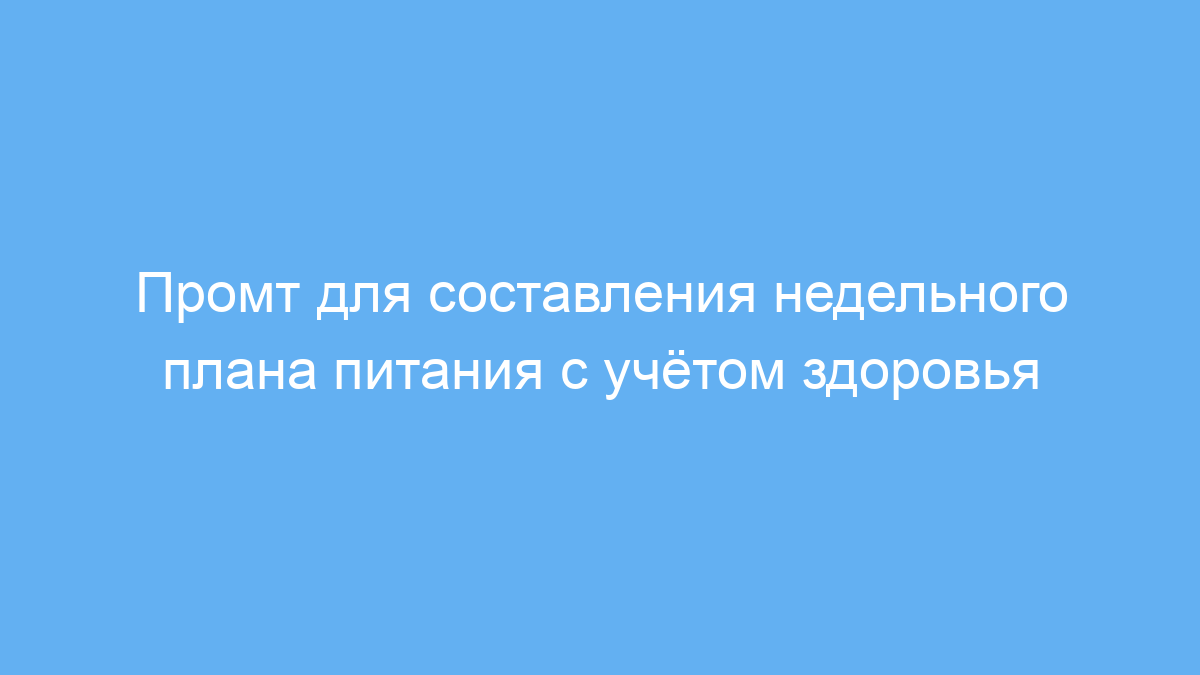 Этот промт предназначен для специалистов по диетологии, нутрициологии и всех, кто хочет быстро и качественно составить недельный план питания. Он помогает упростить процесс планирования рациона, учитывая индивидуальные потребности пользователя: калорийность, цели по питательным веществам и особенности здоровья.