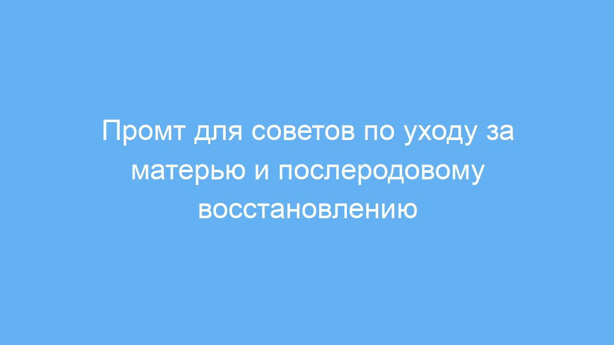 Этот промт предназначен для специалистов, начинающих консультантов и всех, кто заинтересован в качественных рекомендациях по уходу за матерью и восстановлению после родов. Он помогает получить структурированные и содержательные советы по здоровью женщин в послеродовый период.