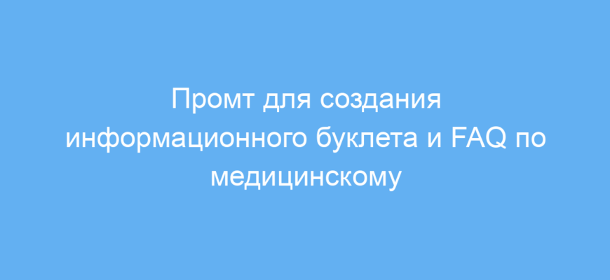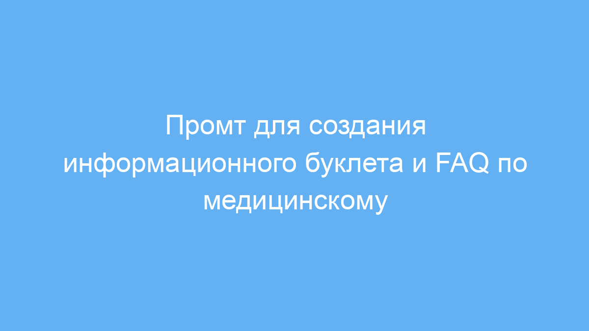 Данный промт предназначен для педагогов, медработников, контент-менеджеров и всех, кто занимается обучением пациентов. Он помогает быстро создавать понятные и информативные буклеты, которые объясняют пациентам суть конкретного медицинского состояния, основы ухода, лечения и другие важные аспекты. Также промт формирует два набора часто задаваемых вопросов с ответами, что облегчает понимание и уменьшает количество повторяющихся запросов к специалистам.