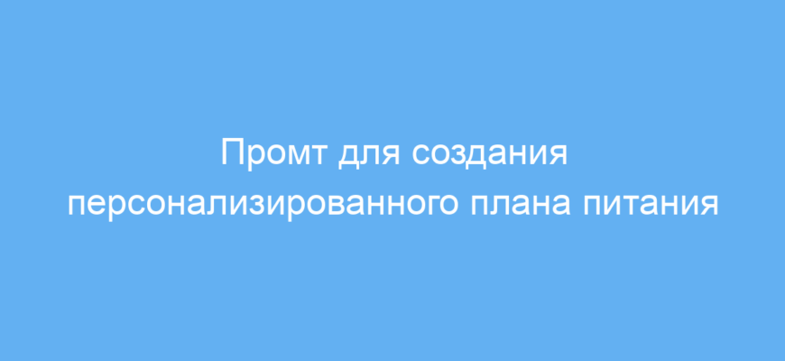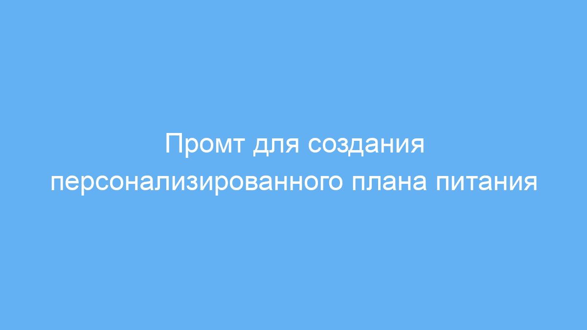 Этот промт подойдет тем, кто хочет получить индивидуальный план питания, учитывающий особенности здоровья, образ жизни и вкусовые предпочтения. Он решает задачи, связанные с подбором рациона питания при различных целях — похудение, набор массы или поддержание веса, а также при наличии пищевых ограничений, аллергий и непереносимостей.