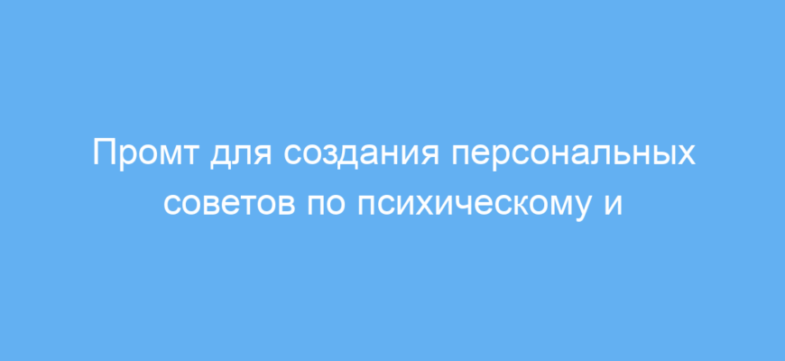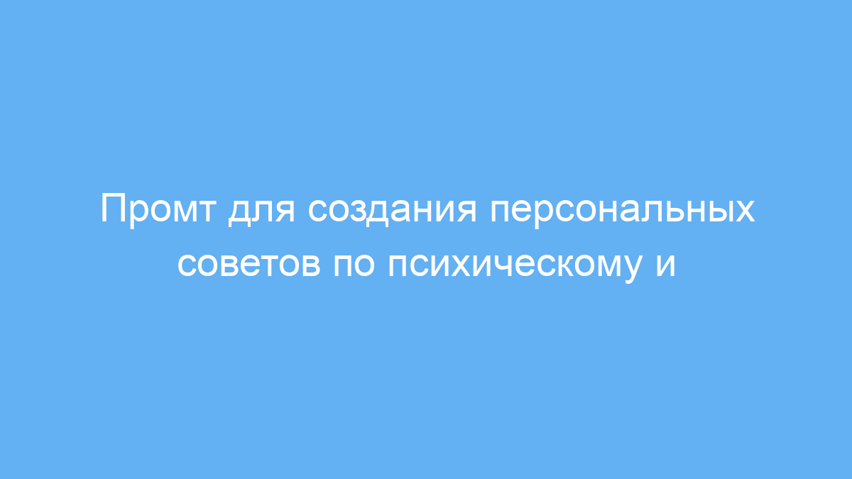 Промт помогает решить проблему нехватки времени и неопределённости в подходах к заботе о себе. С его помощью нейросеть выступает в роли виртуального советника, который анализирует ваше расписание и предлагает конкретные шаги, которые легко внедрить в повседневную жизнь.