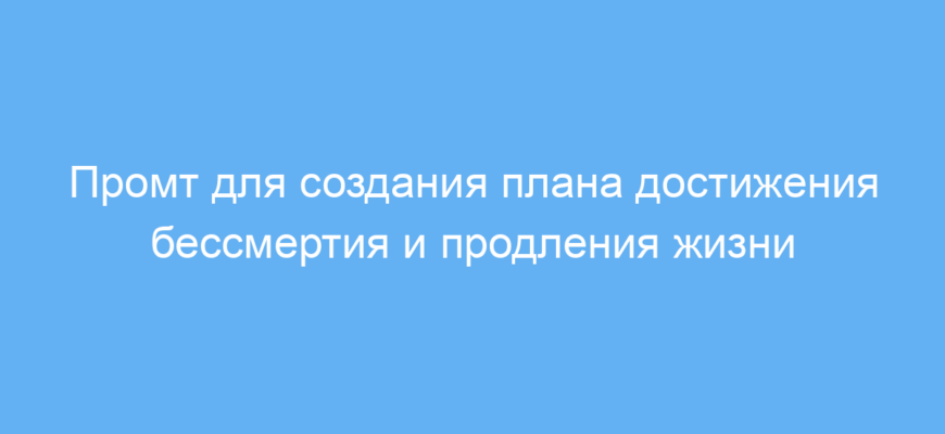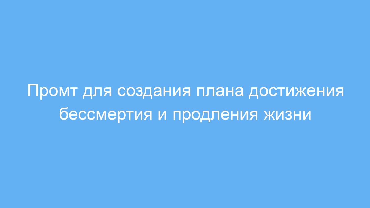 Этот промт предназначен для руководителей, исследователей и энтузиастов, которые изучают или занимаются проблемой продления жизни и достижением бессмертия. Он помогает составить комплексный и поэтапный план на ближайшие 50-100 лет, учитывая современные научные исследования и технологии.